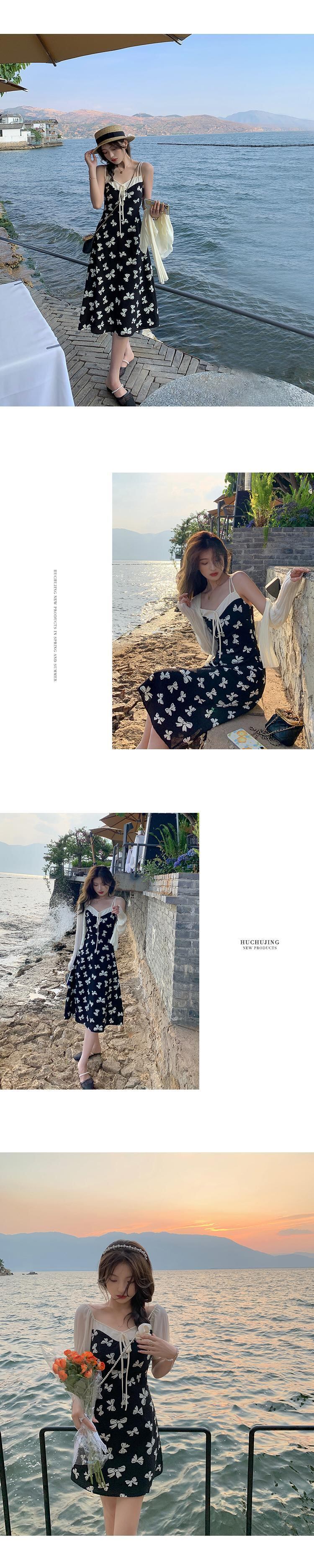 Butterflyデザイン サマースタイルブラックフローラルシフォンウェストドレス レディース 夏物 花柄 HUCHUJING40446190613