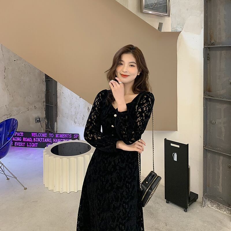スタイルレースドレス スタンダードVネックロング レトロ 長袖 エレガント HUCHUJING62149901214