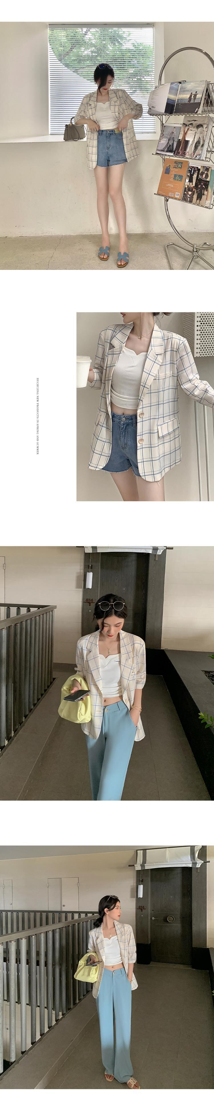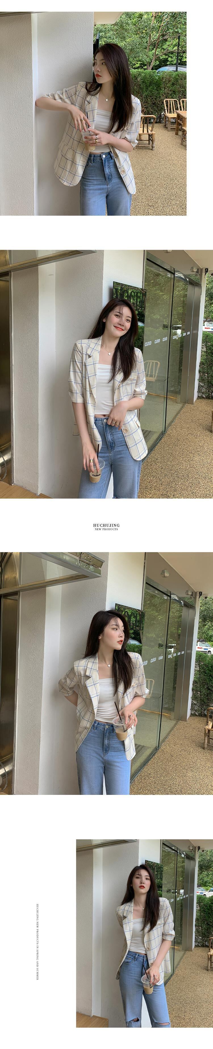 格子柄サマー薄手カジュアルホワイトジャケット コットン 夏物 HUCHUJING78501921151